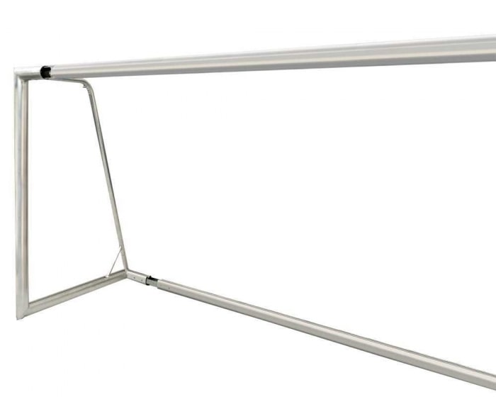 Freistehendes Kleinfeld-Fußballtor mit verschweißten Seitenteilen und zusätzlichen Spezial verstärkten Eckverbindern für noch mehr Stabilität zwischen Torlatte und Torpfosten. Superstabiles Fußballtor mit angeschweißten Netzbügeln aus dickwandigem 60 mm Aluminium-Rundrohr. Gewicht ca. 35 kg, Netztiefe oben 80 cm und unten 100 cm. Hohe Stabilität durch angeschweißte, robuste Netzbügel.