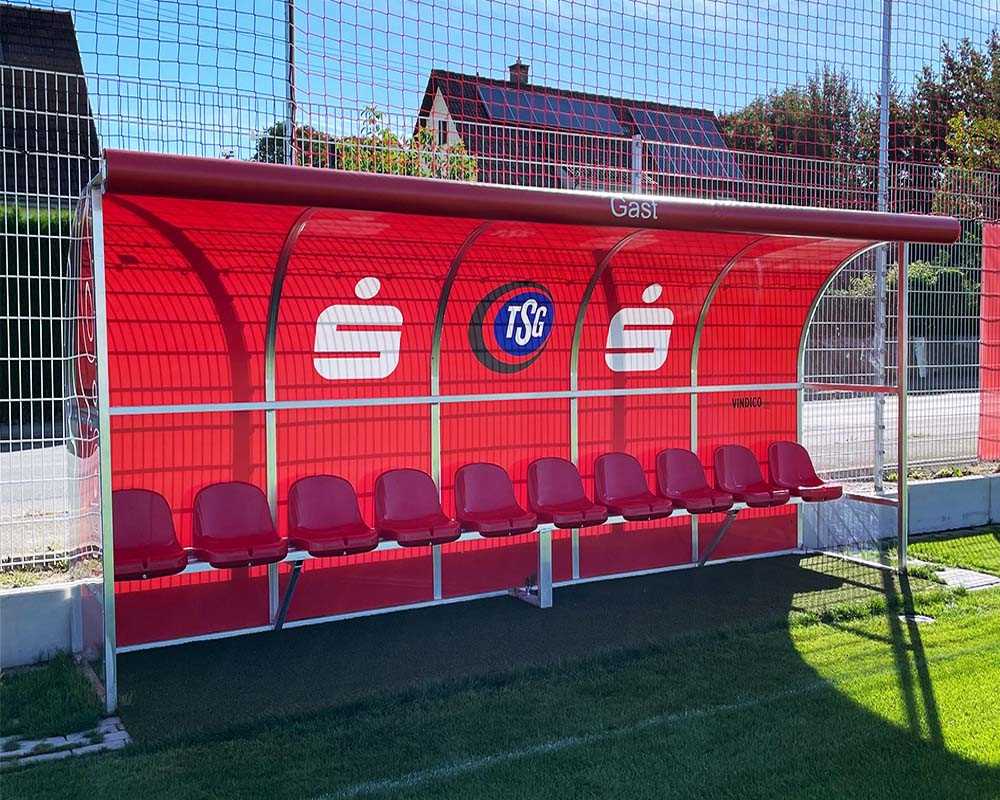Die Spielerkabine wird aus hochwertigen Aluminium-Spezialprofilen gefertigt und komplett in einem Stück vollverschweißt geliefert – kein Aufbau erforderlich. Die Kabine verfügt über eine runde Dachform und ist in vier verschiedenen Längen erhältlich. Die Lieferung erfolgt inklusive Sitzschalen mit Rückenlehne in 7 verschiedenen Vereinsfarben erhältlich.