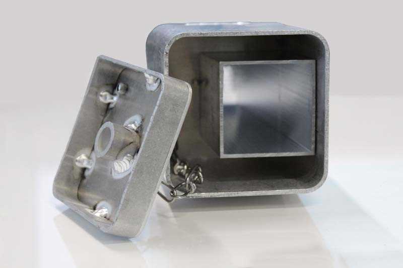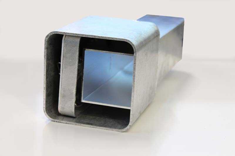 Bodenhülse aus Aluminium für Grenzstangen und Eckfahnen mit einem ∅ von 50 mm, mit Deckel zum Beschichten. Das senkrechte Deckelfach dient zum Aufbewahren des Deckels bei eingestellter Eckfahne. Die Bodenhülse ist innen aus 50 x 50 mm Quadratrohr gefertigt, dadurch kann die Eckfahne leichter heraus genommen werden und verkantet sich nicht. |