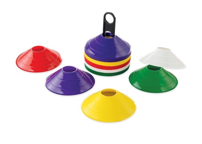 | Ausstattung | Die praktische Trainingshilfe für den Schul- und Vereinssport. Set mit 50 Stück Markierungs Teller in 5 Farben zu je 10 Stück, inkl. praktischem Trageständer. |